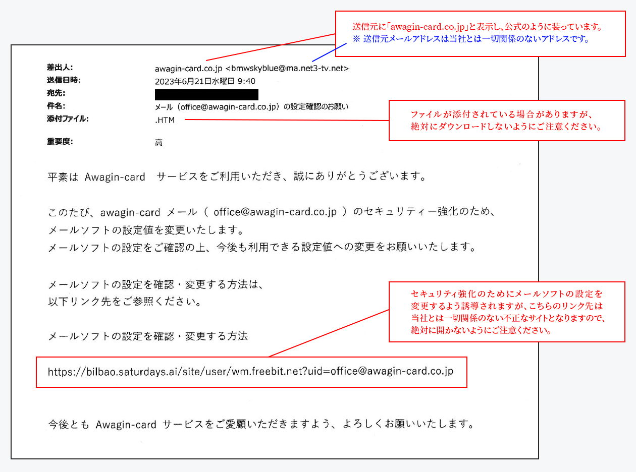 以下のような、当社やVJAグループを装った「なりすましメール」と思われるメールや内容に心当たりがないメール、無関係なメールなどを受信した場合は、ウイルス感染、フィッシングサイトへの誘導、不正アクセスなどの危険がありますので、お客さまにおかれましては、メールの開封、添付ファイルの参照、メール本文中のURLのクリック等を行うことなく、メールごと削除していただきますようお願いいたします。