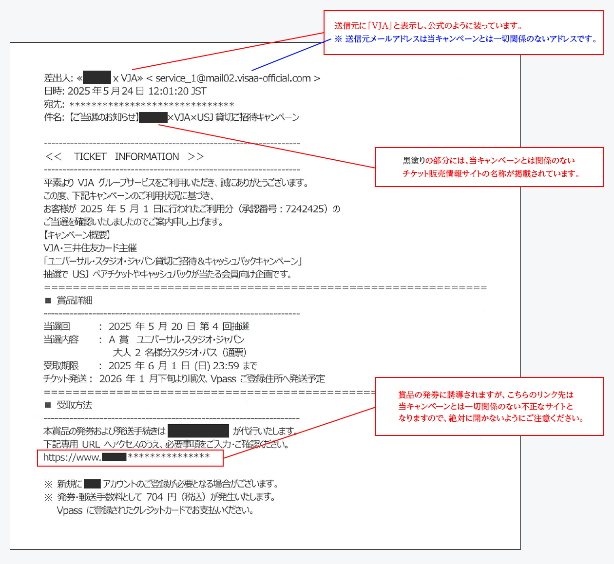 最近、VJA・三井住友カード主催の「ユニバーサル・スタジオ・ジャパン貸切ご招待&キャッシュバックキャンペーン」について、主催者を騙った「ニセ当選メール」が発信されていることが確認されました。